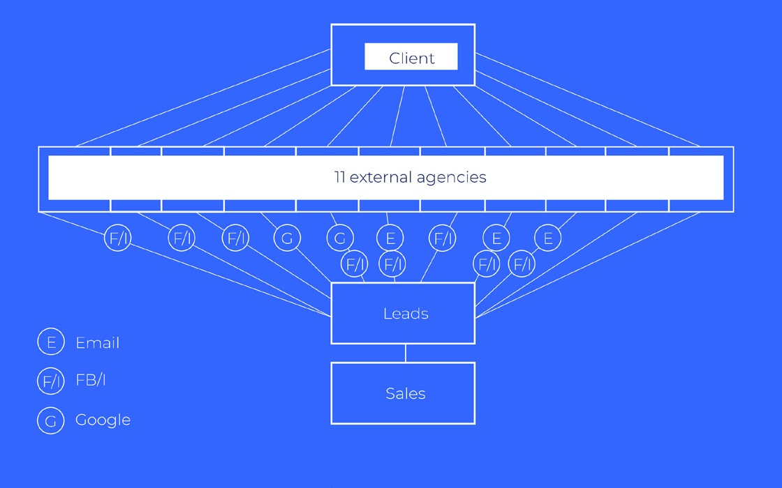 Eleven external agencies running lead generation campaigns. Each agency operated autonomously - choosing their own creative, their own messaging, their own targeting. The client allocated budget and products; the agencies delivered leads.