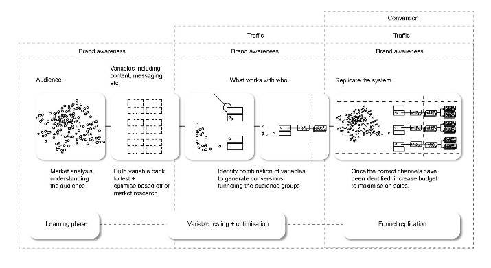 Traffic: Optimisation and retargeting based on what we learned in phase one. Building segments, identifying what messaging worked with whom.